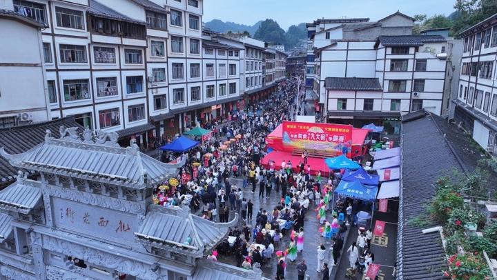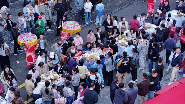 连日来,云南省威信县以非遗美食“九大碗”为主题的长街宴开席。各乡镇的乡土厨师相聚扎西老街,以本地农特产品为原料,精心烹制传统佳肴。这场从丰收节延续至国庆假期的长街宴,为八方游客奉上了一场乡土美食盛宴。