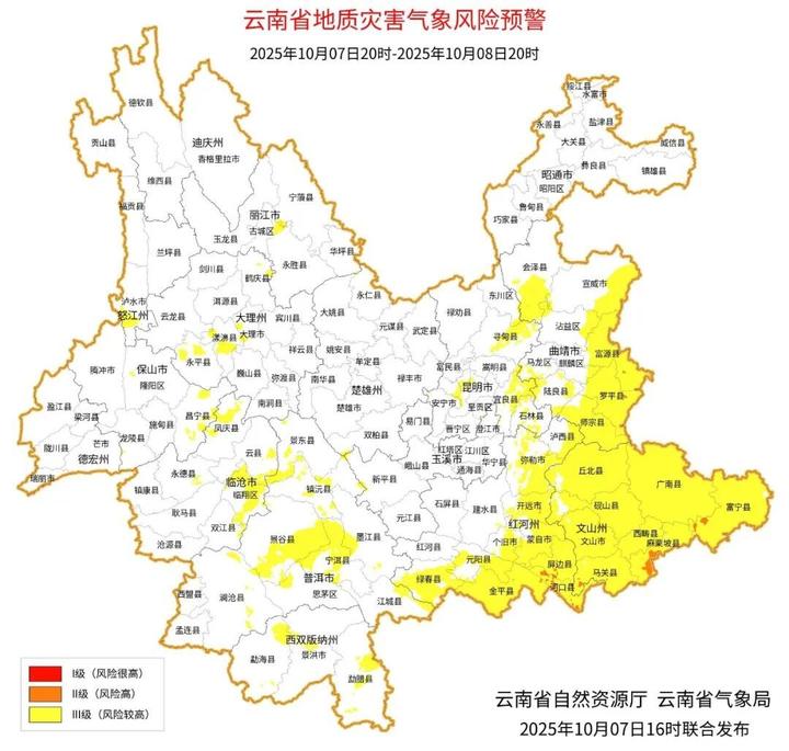 预计2025年10月7日20:00~10月8日20:00,曲靖市富源县、罗平县,红河州开远市、屏边县、河口县、金平县,文山州广南县、富宁县、麻栗坡县、西畴县、马关县发生滑坡泥石流的风险高;昆明市北部、中部和东南部,曲靖市北部、南部,玉溪市东北部、西部,保山市北部、东部和南部,楚雄州南部,红河州东北部至南部,文山州大部,普洱市北部和中部、南部,大理州北部、中部和西南部,德宏州东部,丽江市中部,怒江州南部,临沧市北部、东部发生滑坡泥石流的风险较高。