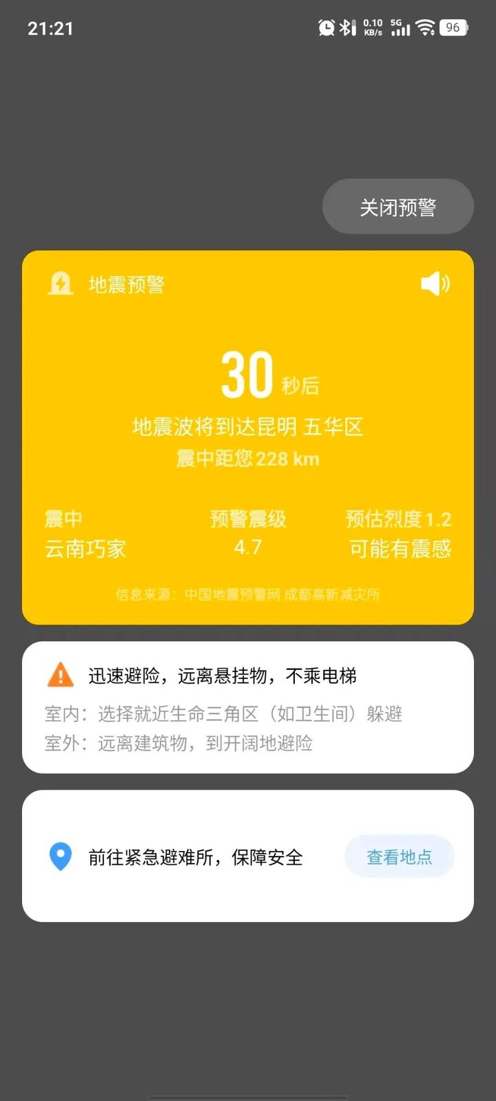 不少昆明人的手机收到地震预警信息