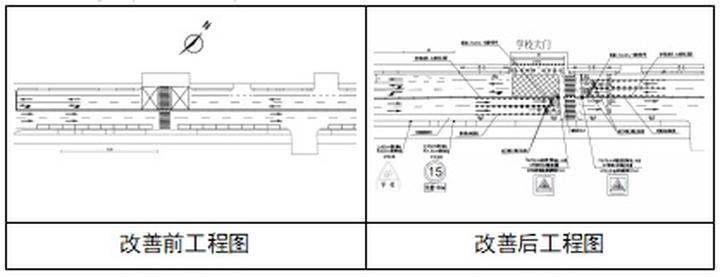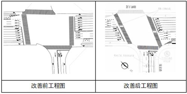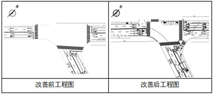 北口增加1条独立左转车道,增大左转通行能力,东口设置提前右转车道;并将南口斑马线前移,缩小路口间距,提升路口通行效率。