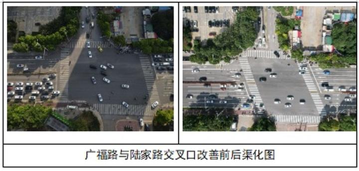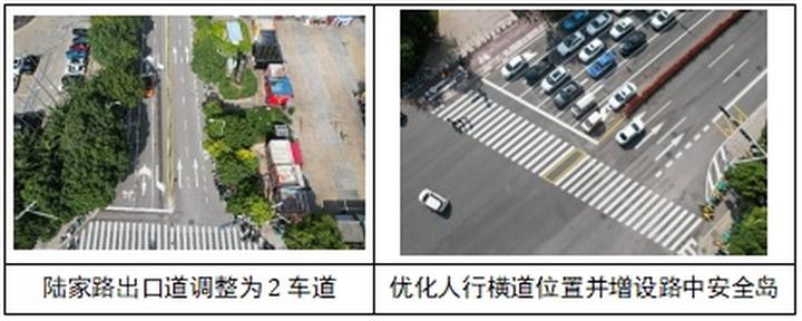 陆家路出口道方向取消原有非机动车道,调整为2条车道,其中右侧为机非混合车道;并优化广福路与陆家路交叉口斑马线,设置路中安全岛,保障行人过街安全。