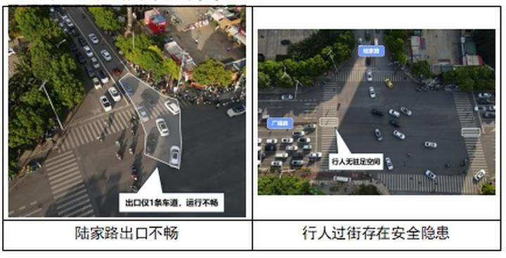 现状陆家路出口道仅有一条车道,车流通行不畅,路中无行人驻足空间,存在安全隐患。