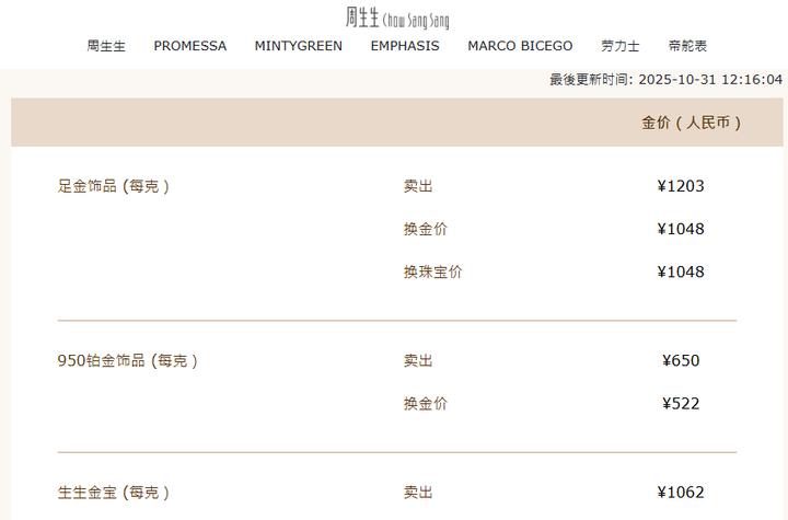 而国内部分品牌金饰克价重回1200元。10月31日,周生生金饰克价为1203元,较前一日上涨28元/克;老凤祥为1200元,单日上涨17元;老庙黄金为1192元/克,单日上涨20元/克。