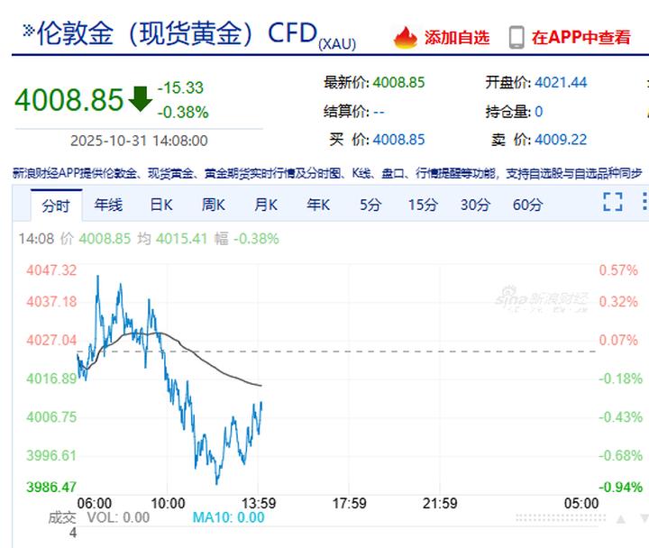 北京时间31日,现货黄金上涨后一度下破4000美元/盎司。截至发稿跌0.38%,报4008.85美元/盎司。