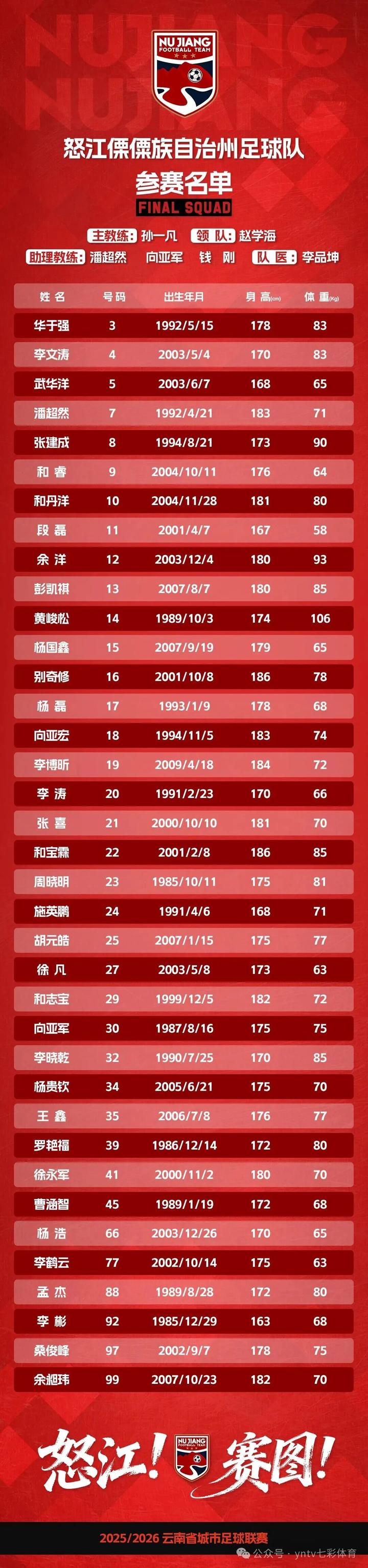 截至目前,已有普洱、丽江、保山、红河、玉溪、曲靖、大理、楚雄、怒江九个州(市)的球员名单出炉。