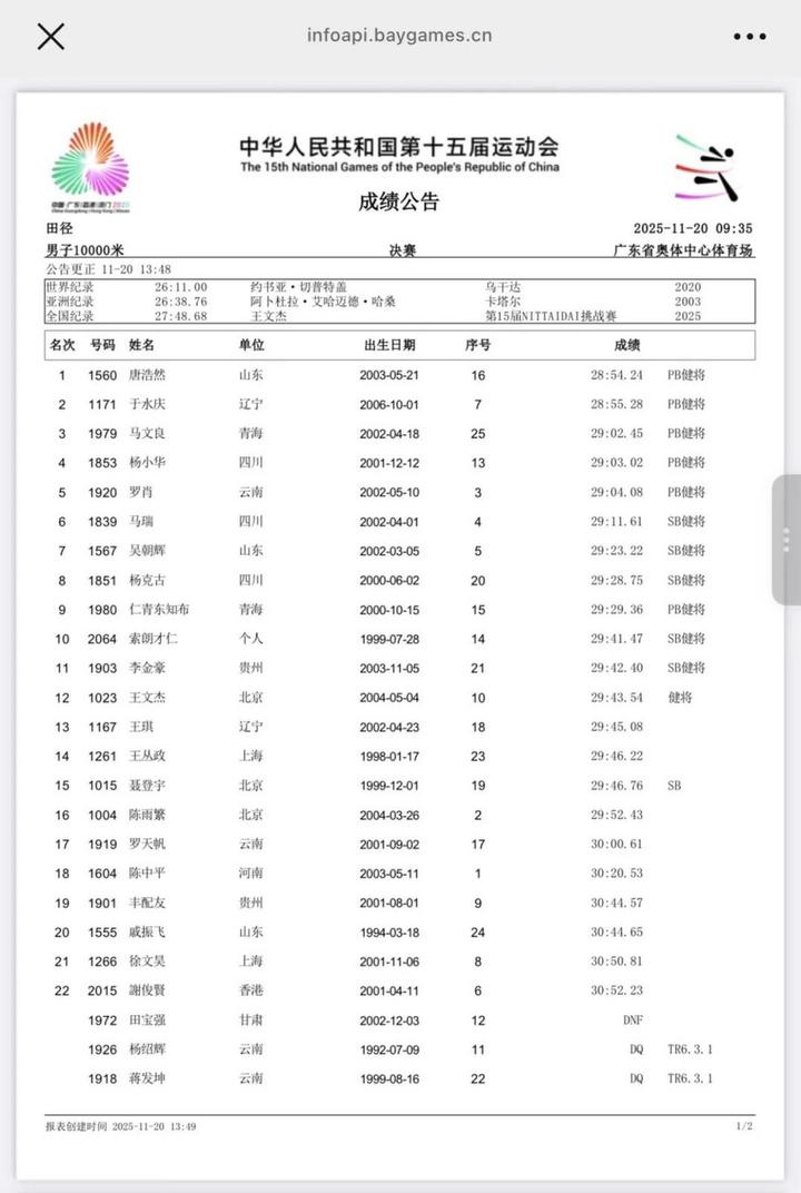 今日(11月20日)上午,第十五届全运会男子10000米项目完赛。在当天下午公布的正式成绩公告中,比赛中率先撞线的云南队选手蒋发坤成绩被取消,山东队唐浩然凭借28分54秒24的成绩递补成为冠军。