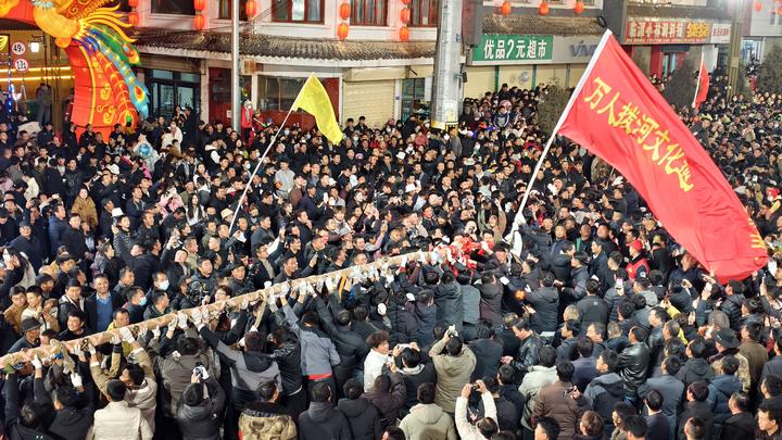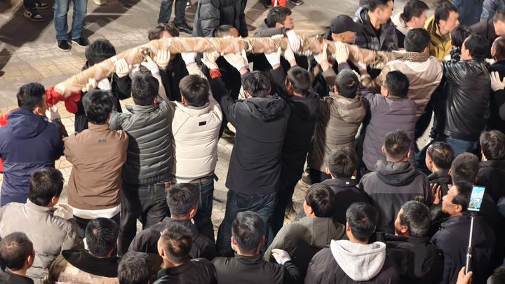 扯绳比赛所用绳索长达1808米、重达16吨,如巨龙横卧长街。活动在3月2日—3月4日(正月十四、十五、十六)连续三晚举办,每晚三局,共九局,既守古礼又添新意,保留“砸杠子”核心仪式,以县城西门十字南北彩门为界,绳端“龙头”穿门即落杠定局,灯光秀与冷烟花同步绽放,沿街音响实时播报,传统仪轨与现代光影交织,氛围感拉满。