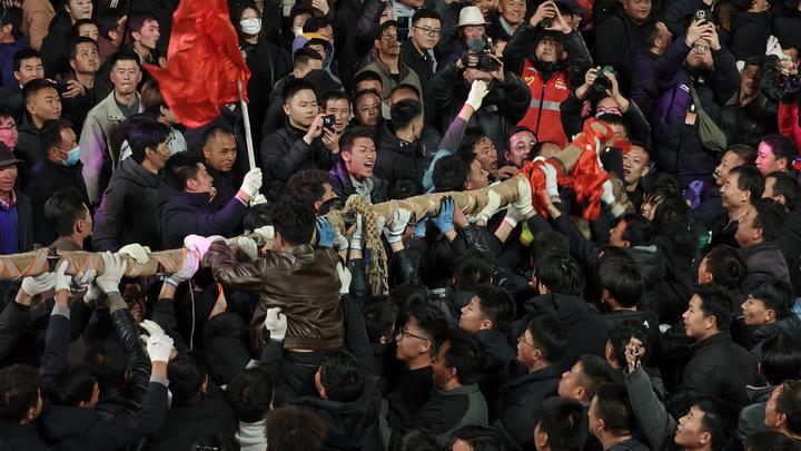 现场从屏息到爆发只在一瞬。号令一响,万人齐发力,号子声、呐喊声掀翻夜空。男女老少攥紧绳索,重心齐沉、马步稳扎,每一寸拉扯都牵动全城心跳。从对这项传承六百余年非遗民俗的陌生好奇,到被万众同心的力量深深震撼,短短一刻,便让现场众人读懂了洮州大地刻在骨血里的传承与凝聚力。