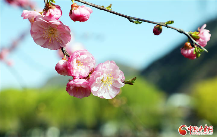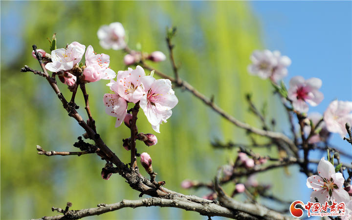 嫩粉桃花绽放枝头,花苞与新蕊相映