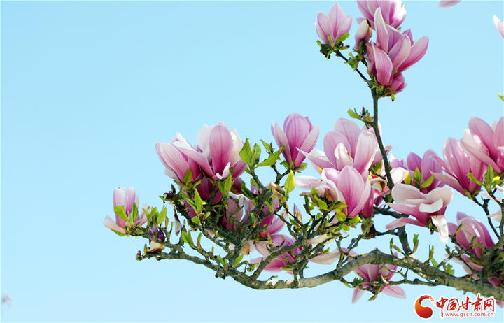 紫玉兰盛放于蓝天之下,花姿舒展新叶初萌