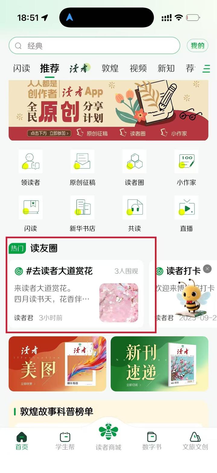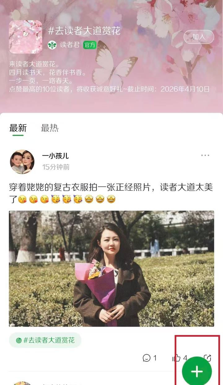 1,登录读者APP首页,进入#去读者大道赏花#话题;