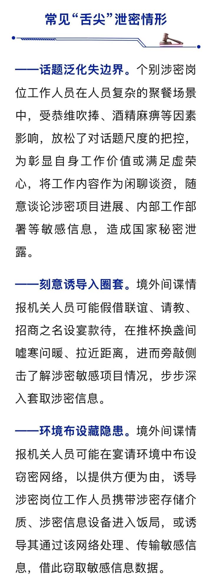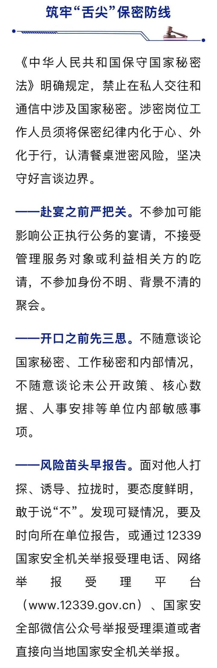 +订阅餐桌并非“真空区”,谈笑亦有“红线纪”。身处涉密岗位的工作人员,一言一行都要格外注意。国家安全机关工作发现,有别有用心之人紧盯餐桌饭局,设圈布局、套取信息。面对无孔不入的间谍窃密活动,涉密岗位工作人员须时刻保持清醒,筑牢“舌尖”上的保密防线。