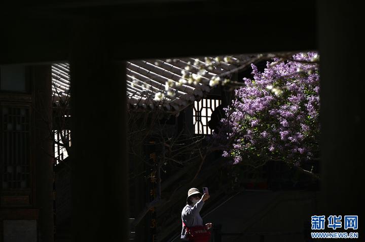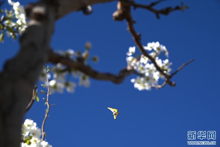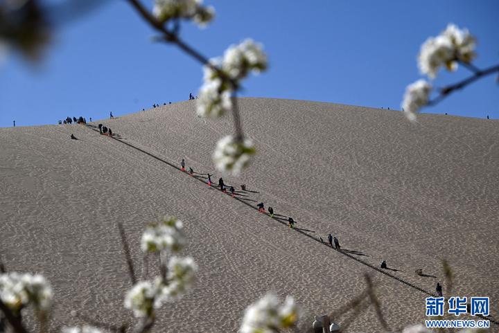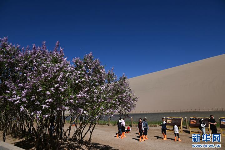 近日,在甘肃省敦煌市鸣沙山月牙泉景区内,梨花、丁香花等竞相绽放,与蓝天、大漠、泉水相映成趣,勾勒出一幅旖旎的春日画卷。新华网发(张晓亮 摄)