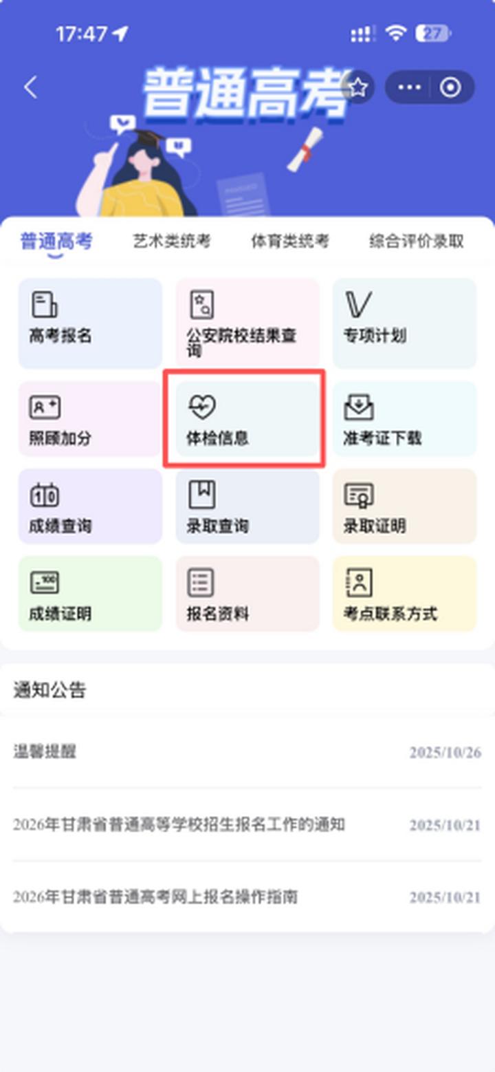 2026年甘肃省普通高等学校招生体检结果查询确认已于2026年4月21日正式开通。请全体考生务必在4月21日至4月30日按时查询本人体检结果并完成确认。体检结果查询及确认途径如下: