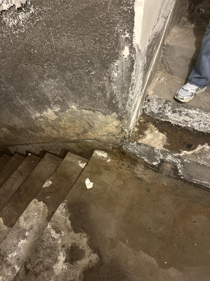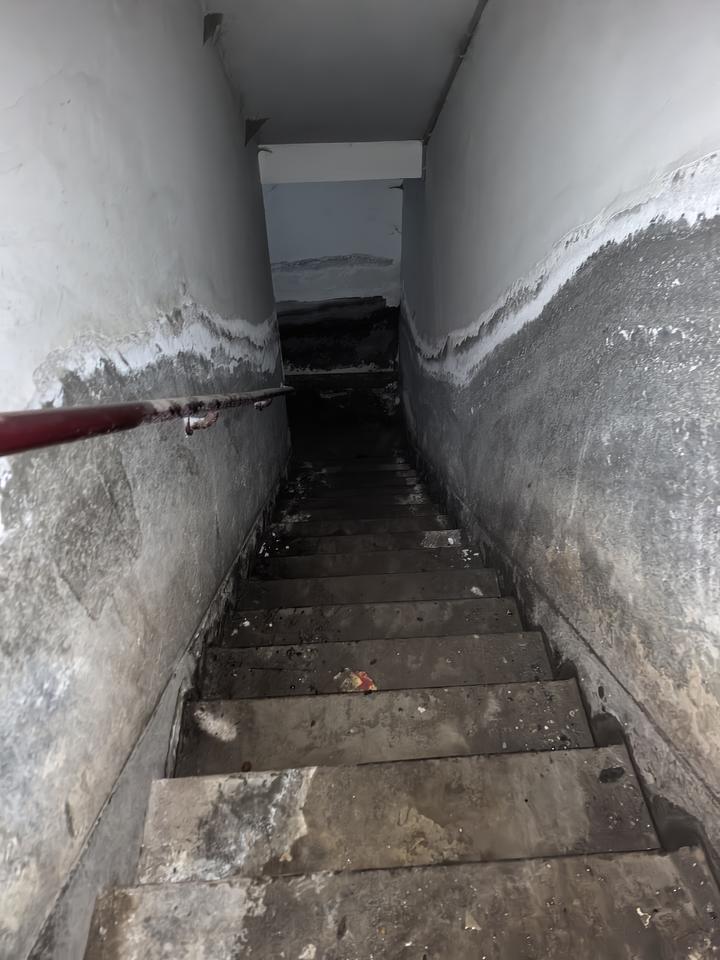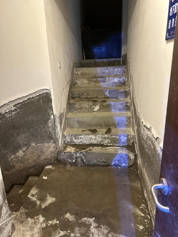 4月21日上午,记者来到亚太·万佳润泽园小区3号楼地下室。刚进入地下室楼梯间,便闻到一股明显的潮湿霉味。沿楼梯下行,可见墙角处有明显水渍渗出,墙面腻子层大面积起皮、脱落,部分区域已露出灰黑色的水泥基层。楼梯转角处淤积着泥沙和积水,地面湿滑难行。