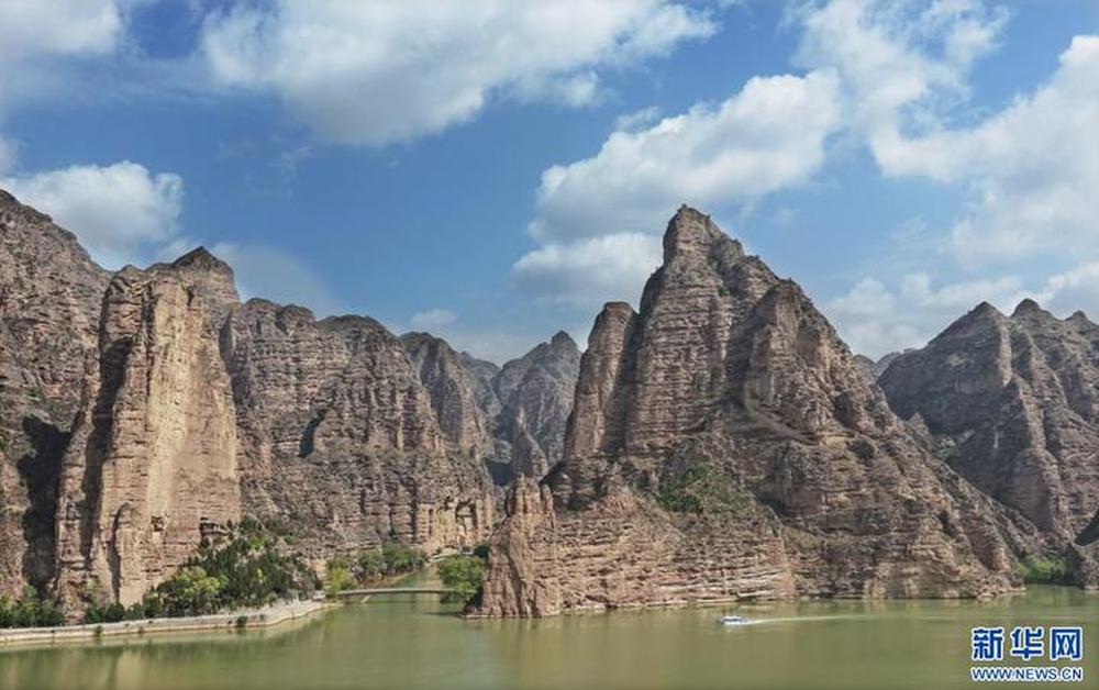 炳灵寺石窟姊妹峰前的游客。 新华网发(吕亚龙 摄)