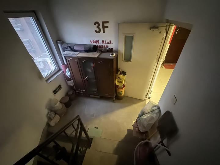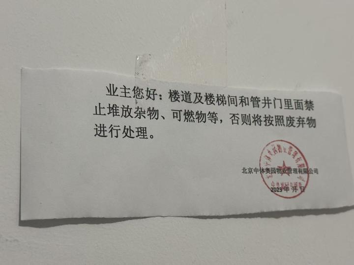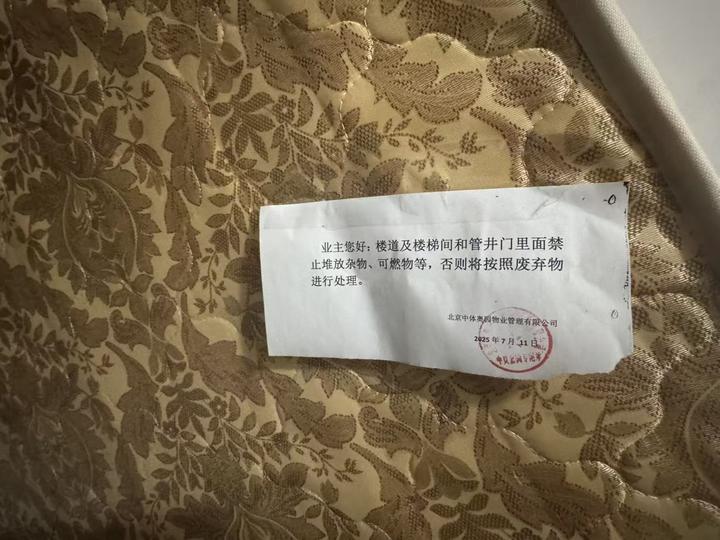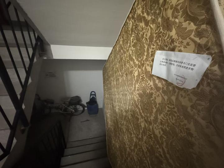 记者在小区内走访发现,楼道堆积杂物的现象有不少。在一期6号楼3单元3层,约8平方米的楼梯间内层层叠叠地堆放着花盆、小推车、三扇门的木柜等杂物,柜顶还摞着瑜伽垫、不锈钢碗、木板等物品。二期楼道同样存在类似现象。在二期9号楼10层,一张斜靠的双人床垫挡住了近三分之一的楼梯通道,床垫上甚至还贴着一份物业于今年7月11日发布的清理通知,写明“楼道内禁止堆放杂物、可燃物等,否则将按废弃物处理”。同楼6层、7层和9层的楼道中,居民放置的小推车上也有不少废纸、纸箱等易燃物。