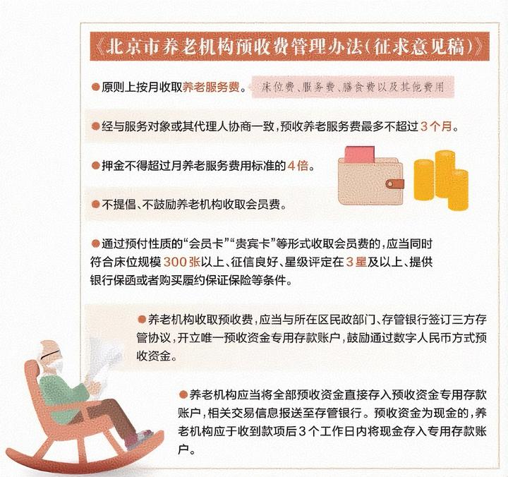 北京市民政局于今年9月牵头起草了《北京市养老机构预收费管理办法(征求意见稿)》,规定养老服务费(床位费、服务费、膳食费以及其他费用)最多收取3个月,押金不得超过月养老服务费用标准的4倍。不提倡、不鼓励养老机构收取会员费,若收取会员费,养老机构要满足一系列指标条件。包括近期民政部、金融监管总局印发的《养老机构预收费存管工作指引》,要求养老机构原则上通过存管银行收取押金、会员费,也都是为了防范大额预付费资金风险。