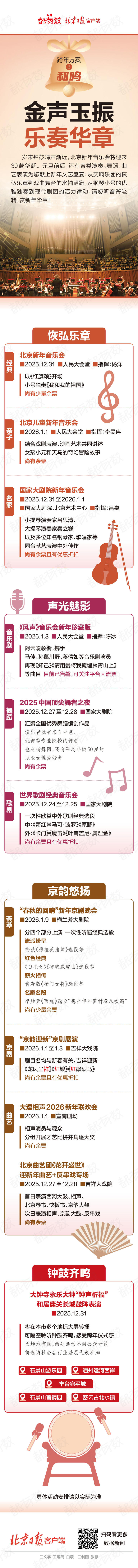 +订阅岁末钟鼓鸣声渐近,北京新年音乐会将迎来30载华诞。元旦前后,还有各类演奏、舞蹈、曲艺表演为您献上新年文艺盛宴:从交响乐团的恢弘乐章到戏曲舞台的水袖翩跹,从钢琴小号的优雅独奏到现代剧团的活力律动,请您听音符流转,赏新年华章!