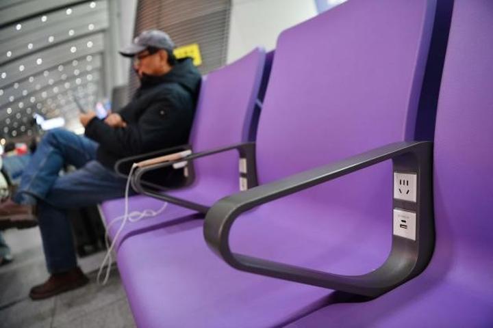 候车区域的充电需求也得到充分满足,车站在二楼候车室西北区、东北区等5个区域,布设了285把带有充电插座的免费充电座椅,与普通蓝色座椅区分的紫色充电座椅,让旅客可边休息边充电。同时,候车室内还设置4个充电台,兼具USB接口和电源插座,满足不同旅客的充电需求。