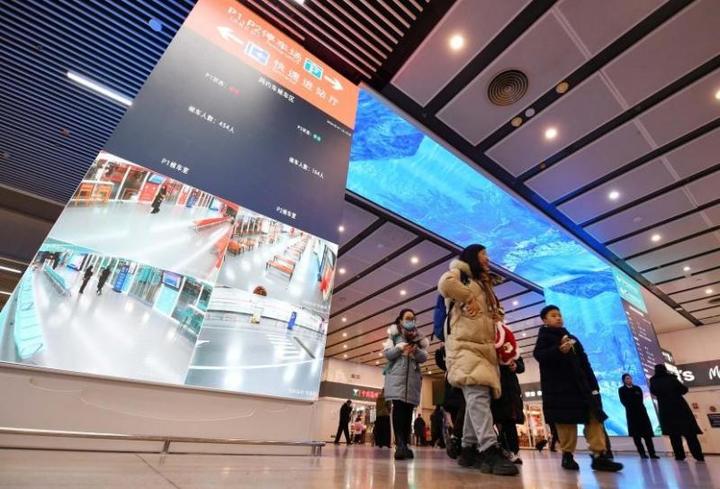 10点10分,P1停车场网约车候车区出现拥堵,候车人数454人,P2停车场舒适,候车人数164人……北京南站地下换乘层西侧通道,一块高5米、长10米、总面积135平方米的智能LED“天幕屏”正式上岗,成为车站智慧服务的新亮点。这座形似迎宾门的“天幕屏”,其立柱式智能屏可实时显示站内区位图、停车场引导标识,还能同步播报出租车、网约车候车情况。“旅客可根据实时数据和视频影像,灵活选择停车场或出租车调度站,避开拥堵区域。”中铁世纪传媒广告有限公司北京南站分公司经理柳剑介绍道。