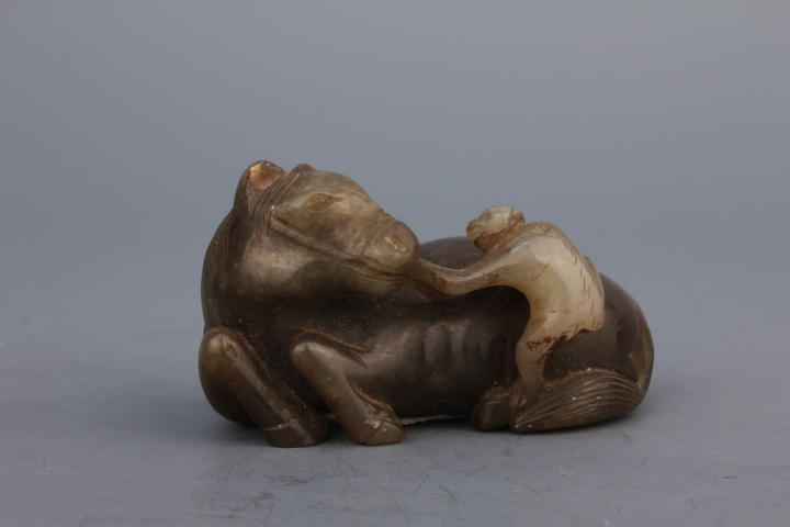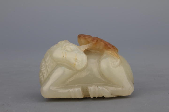 展览特别展出了一对艺博馆藏的清代“马上封侯”主题玉饰。同样是青玉质地,两件玉饰造型栩栩如生:一件雕刻的是趴伏回首的“白马”,玉石黄色的部分雕成一只伏于马背的猴子、眉眼灵动;另一件是侧卧的“黑马”,四肢屈于腹下,马腿上立一顽猴,侧身抬腿,背部微弓,正想跨于马身,双手紧紧摁住缰绳。“猴”与“侯”谐音,与马的形象组合出现,寓意“马上封侯”。