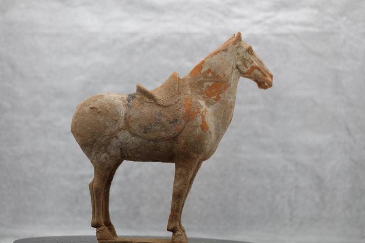 不同时期的代表性文物展出,带领观众纵览千年马文化。唐代红陶彩绘马以写实手法塑造骏马形象,生动刻画了马的雄健体态,不仅展现唐代精湛的雕塑工艺,更反映了当时养马业兴盛的背景,体现马匹在军事、交通、狩猎等领域的核心地位。清代青花刀马人物纹盘则描绘了武将策马驰骋的场景,纹样取材于历史演义故事或戏曲剧目,通过流畅线条勾勒战马奔腾的姿态,展现出动态美感。