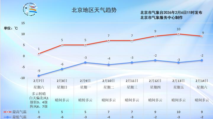 北京市气象台6日14时发布:今天下午多云间阴,西部山区有零星小雪,北转南风二三间四级,最高气温-3℃;夜间多云间晴,南转北风一二级,最低气温-10℃。寒潮蓝色预警中。