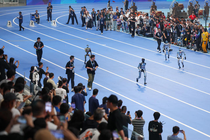 首届世界人形机器人运动会上,多台机器人参与争夺“百米”飞人。潘之望摄