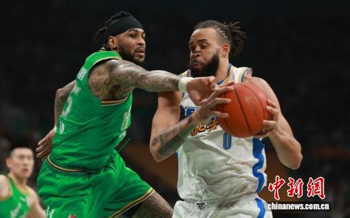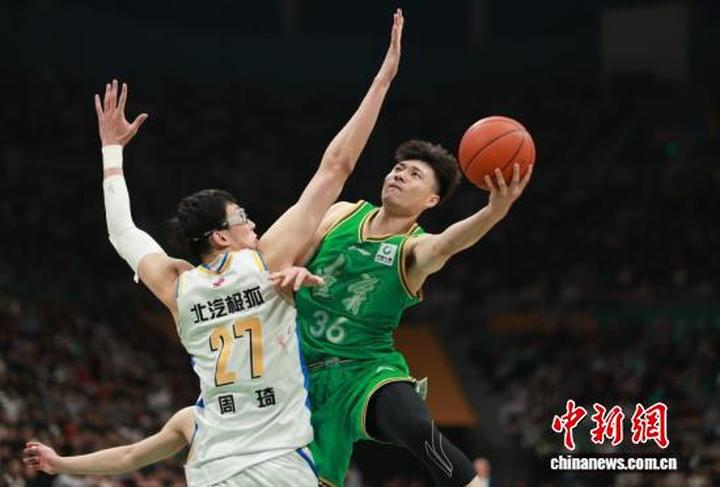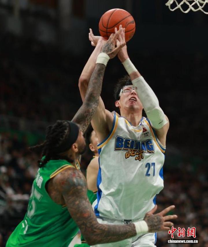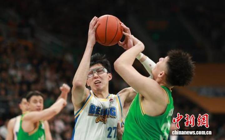 北京北汽队球员周琦(右)在比赛中。
