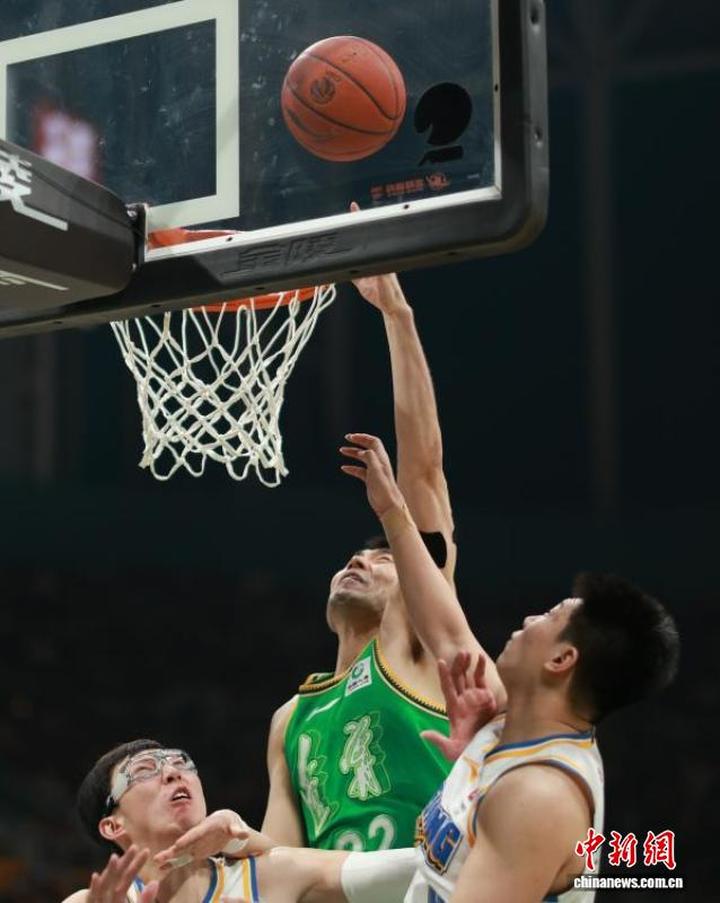 北京北汽队球员周琦(左)在比赛中进攻受阻。