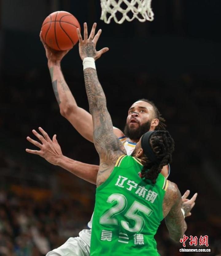 辽宁本钢队球员莫兰德(左)在比赛中拼抢。