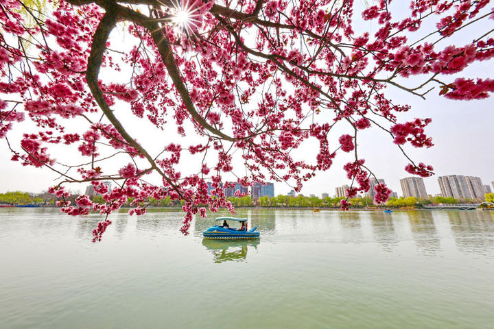 ↑2026年3月30日,游人乘船在北京玉渊潭公园游玩。CICPHOTO/刘宪国 摄