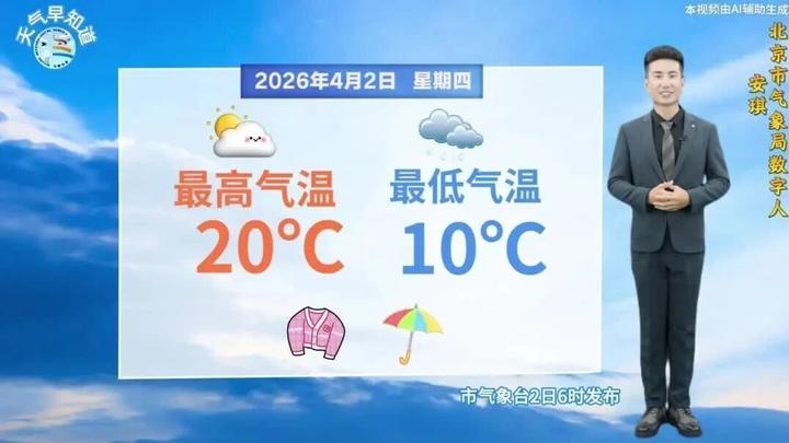 今天白天晴转多云,北转南风二三级,最高气温20℃;夜间多云转阴,后半夜有分散性雷阵雨或阵雨,南转北风一二级,最低气温10℃。 今天白天适宜户外活动,但昼夜温差大,请适时调整着装。今天后半夜至明天上午有弱降水,雨后北风加大,请注意防范。北京市气象台2日6时发布