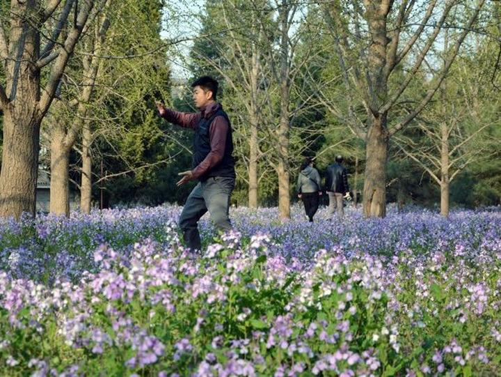 4月1日,在北京市第五幼儿园亲子托育活动现场,家长和孩子在老师引导下参加户外活动。