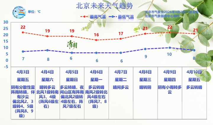 本周末即将迎来清明节气,也是祭扫的高峰时期。4月4日至6日清明假期期间,北京多大风天气,白天阵风6级至8级,夜间风力减弱。天干物燥,请注意文明祭扫,严禁一切野外用火。