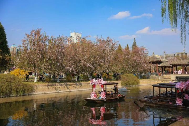 走在位于元大都城垣遗址公园内的海棠花溪,河道两旁海棠花正在次第开放,河道内水流清澈,花影树影婆娑。在小关闸,摇橹船一字排开,在做最后的装饰,“明天就会正式启航。”负责运营的相关负责人表示,乘船穿行在河道里,抬头就是垂到水面的花团,低头能看到花影映在碧波里,花瓣飘在船边,真的就是“船在水中行,人在画中游”,不出京城就能邂逅江南诗意。从水上视角,还能把元大都城墙遗址的全貌尽收眼底,一边赏春日花海,一边触摸千年古都的历史文脉。“摇橹船都是人工摇橹,没有机械噪音,能安安静静沉浸式赏花。”该负责人说。