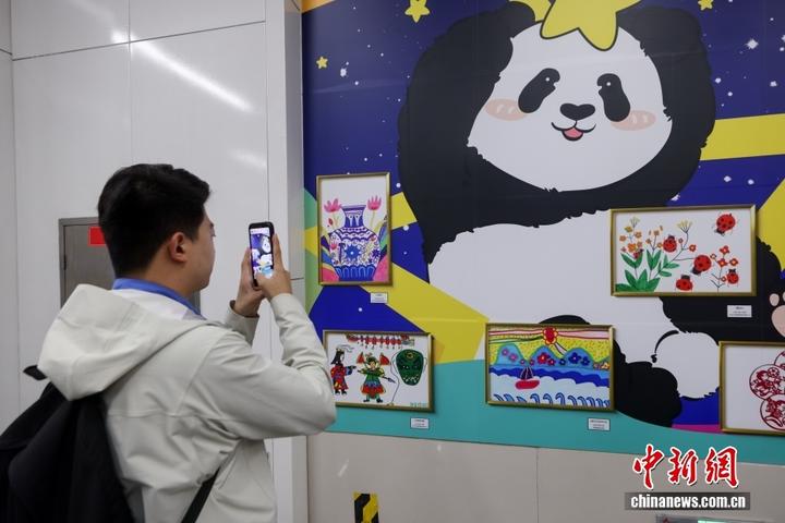 4月2日,乘客驻足观看孤独症儿童的绘画作品。