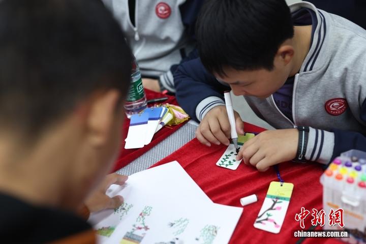 4月2日,孤独症儿童绘制书签。