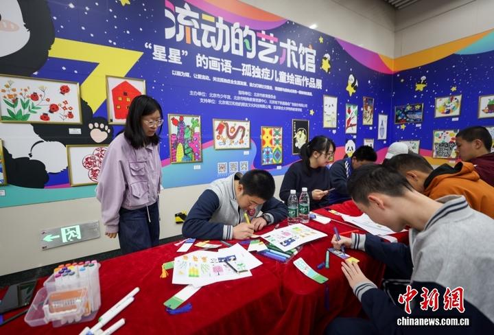 4月2日,孤独症儿童绘制书签。当日正值第19个“世界孤独症日”,北京地铁6号线朝阳门站内举办“流动的艺术馆——以画为媒,用爱点亮‘星’空”融合公益活动。现场展出来自北京市特殊教育资源中心的孤独症儿童的画作,并有多名孤独症儿童亲自来到现场手绘书签,体验地铁无障碍设施。