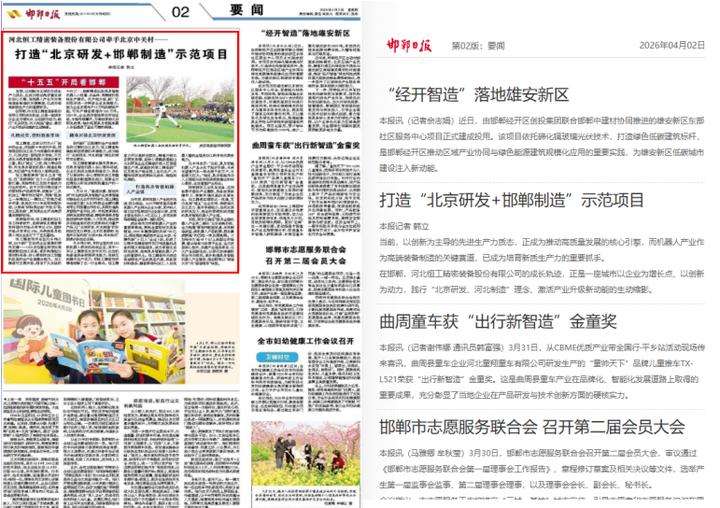 4月2日,《邯郸日报》2版头条刊发《河北恒工精密装备股份有限公司牵手北京中关村——打造“北京研发+邯郸制造”示范项目》