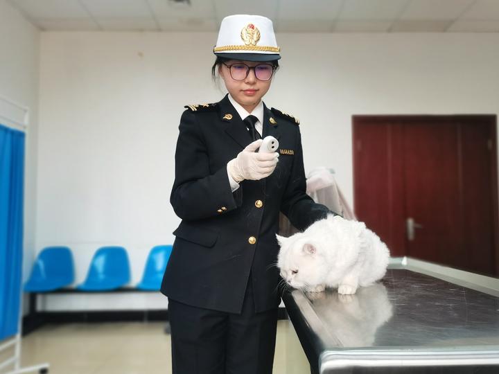 北京海关所属通州海关关员对一只出境宠物猫进行检疫