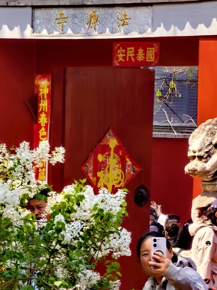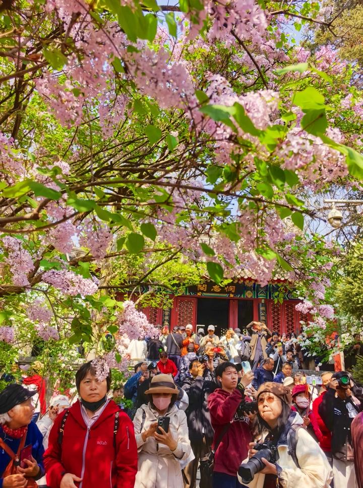 今天是清明节假期首日,到北京法源寺踏青观赏丁香花的游人络绎不绝。