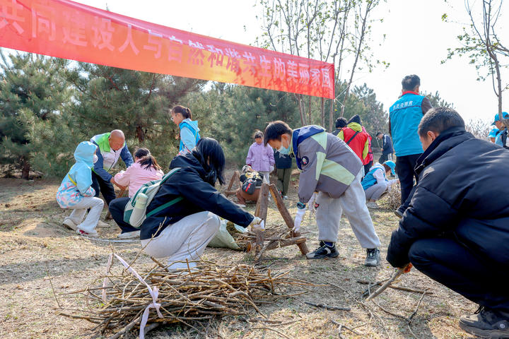 在通州区一家公园,市民在搭建人工灌丛。通讯员何建勇摄