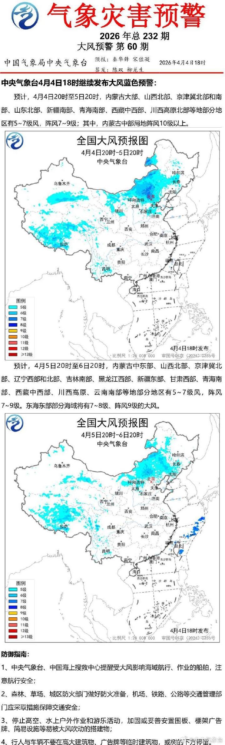 中央气象台4月4日18时继续发布大风蓝色预警。