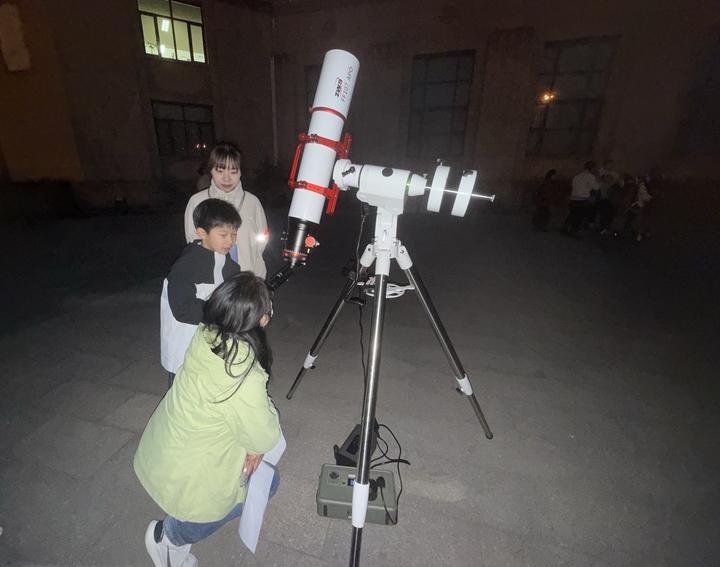 19时,观众排队通过望远镜近距离观测行星。“木星旁边的点点是什么?肉眼看不到,我数了数,周围有四个亮点。”工作人员回答:“木星旁边的四个亮点是四颗伽利略卫星,像忠实的小跟班,一直围着它转。仔细看,还能看到它标志性的云带和大红斑。”