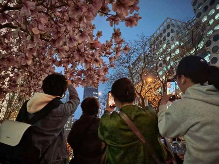 离开常营公园,记者又来到了国贸地区光华路SOHO二期附近。这里聚集了不少年轻人,他们举着手机或相机,正在拍摄玉兰花与国贸“三件套”建筑同框的画面,在这里,玉兰花带来的是这座城市快节奏和慢生活的融合。