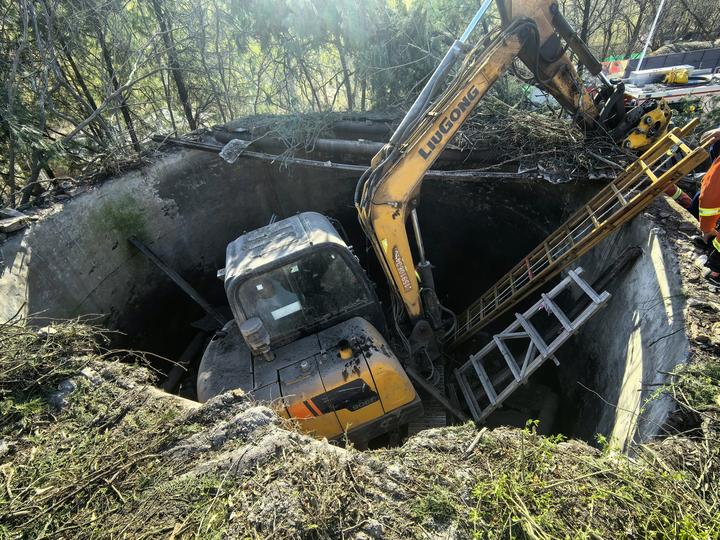 一台挖掘机连同司机掉进井里。