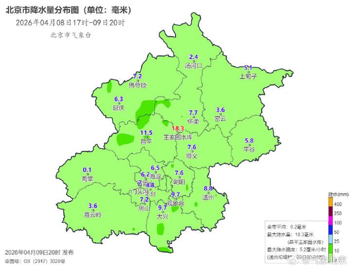 8日17时至9日20时,全市平均降雨量6.2毫米,城区平均6.5毫米,最大降水量在昌平王家园水库,18.3毫米。