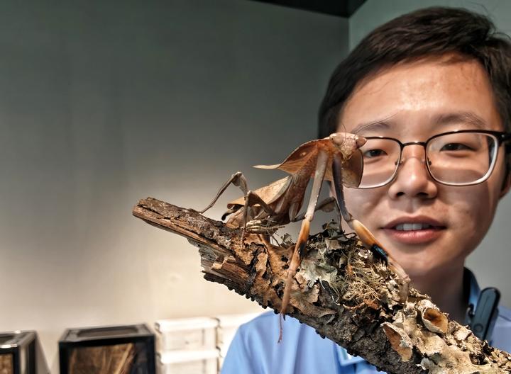 工作人员在活体动物互动区展示眼镜蛇枯叶螳螂。新京报记者 陶冉 摄